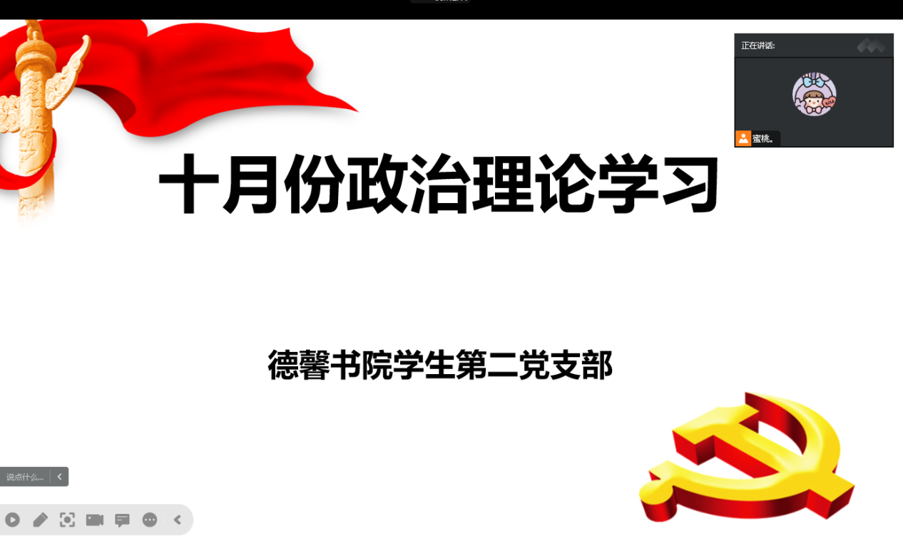 10月29日,德馨书院学生第二党支部在腾讯会议开展十月份政治理论学习。会议由侯吉昀书记召开,学生第二党支部全体党员参加。