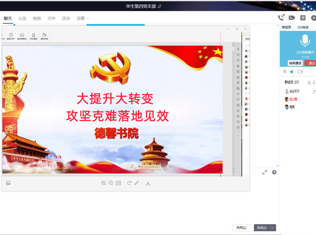 3月22日,德馨书院学生第四党支部在德馨书院会议室开展召开“大提升大转变攻坚克难落地成效”的主题党日活动,参加会议的有支部书记吴兵营、组织委员高明、宣传委员赵心煜同志。