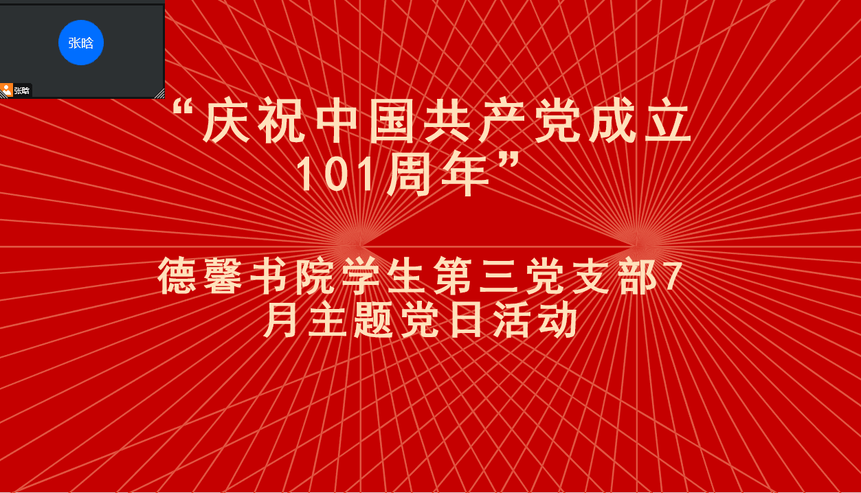 为热烈庆祝中国共产党成立101周年,重温党的光辉历史,弘扬党的光荣传统和优良作风,激励和引导广大党员坚定理想信念、牢记初心使命,以浓厚的党建氛围迎接党的二十大胜利召开,2022年7月15日,德馨书院学生第三党支部开展了以“庆祝中国共产党成立101周年”为主题的七月主题党日活动。