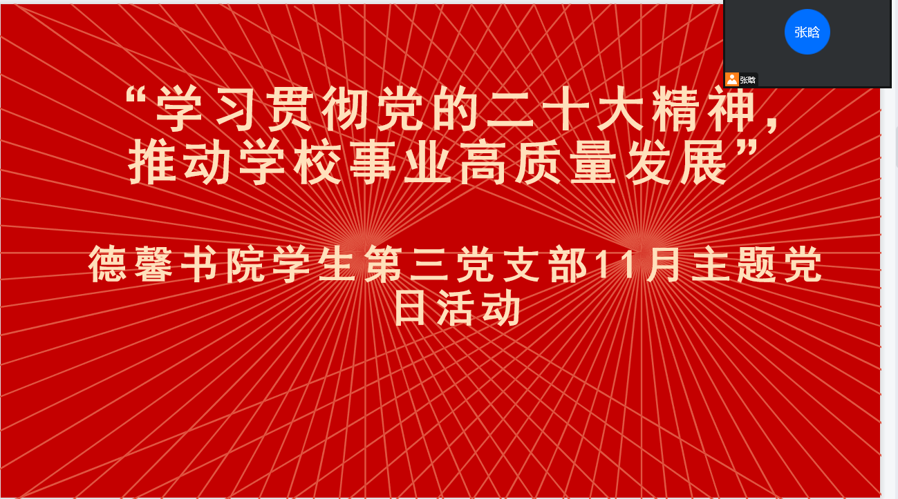 学习宣传贯彻党的二十大精神是当前和今后一个时期教育系统的首要政治任务,为系统动员教育广大党员干部和师生员工更加紧密地团结在以习近平同志为核心的党中央周围,高举中国特色社会主义伟大旗帜,落实立德树人根本任务,德馨书院学生第三党支部于11月20日,通过腾讯会议召开本月“学习贯彻党的二十大精神,推动学校事业高质量发展”主题党日活动及十一月政治理论学习,党支部全体党员参加本次活动。