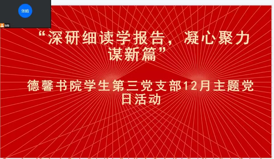 认真学习宣传贯彻党的二十大精神,事关党和国家事业继往开来,事关中国特色社会主义前途命运,事关中华民族伟大复兴,要全面准确深入宣讲党的二十大精神,帮助广大党员干部不断加深对党的二十大精神的理解和把握。根据我校十二月主题党日活动要求,德馨书院学生第三党支部于12月20日通过腾讯会议召开本月“深研细读学报告 凝心聚力谋新篇”主题党日活动,党支部全体党员参加本次活动。