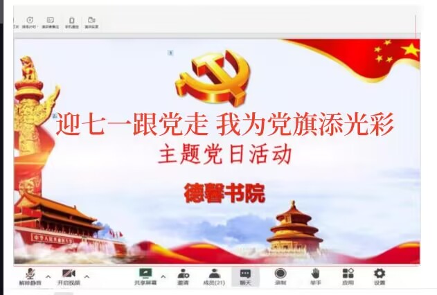 6月23日,德馨书院学生第一党支部于线上开展“迎七一跟党走,我为党旗添光彩”主题党日活动,会议由支部书记吴兵营主持,学生第一党支部全体党员参加。