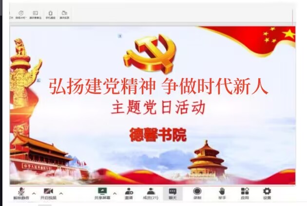 7月20日,德馨书院学生第一党支部在腾讯会议开展“弘扬建党精神,争做时代新人”主题党日活动。会议由党支部书记吴兵营主持,支部全体党员参加。