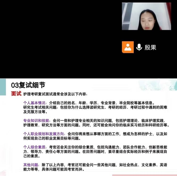 随着考研成绩的陆续公布,各位考研学子也蓄势待发准备复试,为了帮助考研学生充分了解研究生复试的流程、内容、技巧及调剂等相关知识,3月6日,德馨书院联合护理学院通过腾讯平台为考研学生开展线上考研复试指导。会议邀请了新乡医学院三全学院护理学院赵菲和殷果两位老师为考研学子答疑解惑,助力学子考研梦,一战成硕。