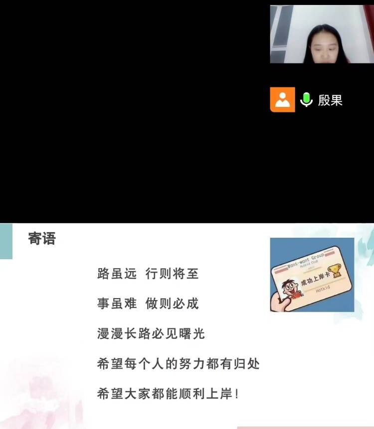 交流会上,赵菲老师向大家介绍了复试的内容及流程,围绕复试内容、复试材料、复试细节以及调剂四个方面进行分享与指导,主要包括:一、针对自己报考的学校进行了解,有针对性的学习专业理论知识,同时要先对自己的综合素质能力和英语能力进行锻炼;二、要提前根据学校要求准备好复试所需要的相关证件等;三、强调了面试过程中不能迟到,同时要注意自己的仪容仪表,语言表达等。殷果老师为大家分享了一些面试常见的导师提问问题以及一些复试的小技巧,叮嘱需要调剂的学生要提前准备,积极寻找导师,此外,针对大家在准备复试过程中存在的一些问题进行了解答。最后,两位老师也温馨的给予大家复试成功寄语!