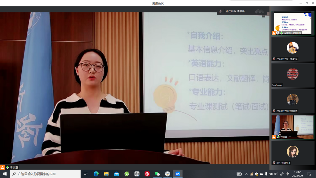 刘明月老师从自我介绍、面试材料的准备以及简历制作等方面进行了细致的讲解,同时给大家强调要注意面试时的仪容仪表和言谈举止等问题。刘老师的指导给复试的同学们提供了宝贵的经验,提升了同学们的准备效率,为复试成功奠定坚实基础。