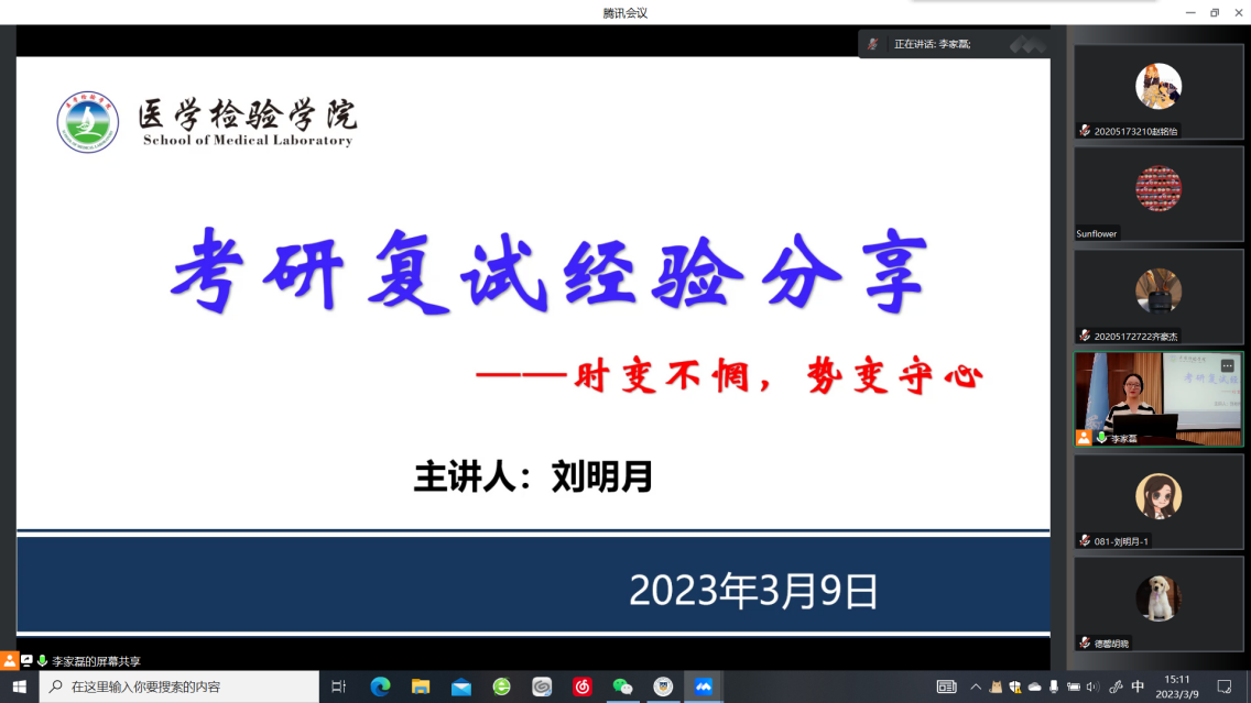为保证考研学子复试顺利上岸,德馨书院联合医学检验学院于3月9日举办考研复试指导讲座,本场讲座邀请了医学检验学院院长贺志安教授和刘明月老师为学生做复试面试及调剂指导,医学检验学院李家磊老师主持会议。