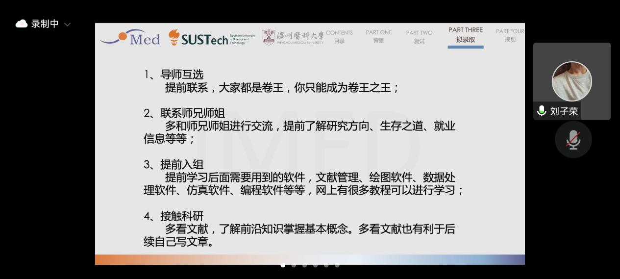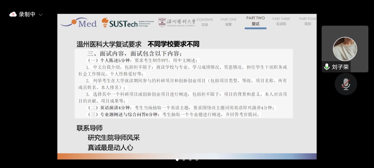 为持续做好毕业生考研复试指导工作,保证我院考研学子复试成功,3月16日考研复试指导邀请了温州医科大学2022级生物医学工程专业研究生刘子荣同学为复试学子做考研复试指导。