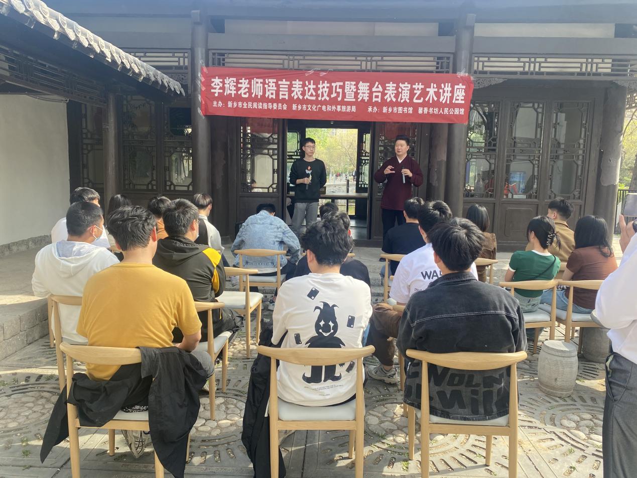 为贯彻落实党的二十大关于深化全民阅读活动的重要部署,提高大学生的文学素养,激发大学生对阅读的兴趣,增强大学生的语言表达能力,提升其文学鉴赏水平,德馨书院党总支与新乡市图书馆于4月9日在新乡市人民公园馨香书坊共同举办了“春风四月暖,阅读正当时”系列活动之李辉老师语言表达技巧暨舞台表演艺术讲座。此次讲座由中国语言艺术培训导师、新乡市朗诵演讲协会副主席李辉老师主讲,吸引了众多观众到场聆听。