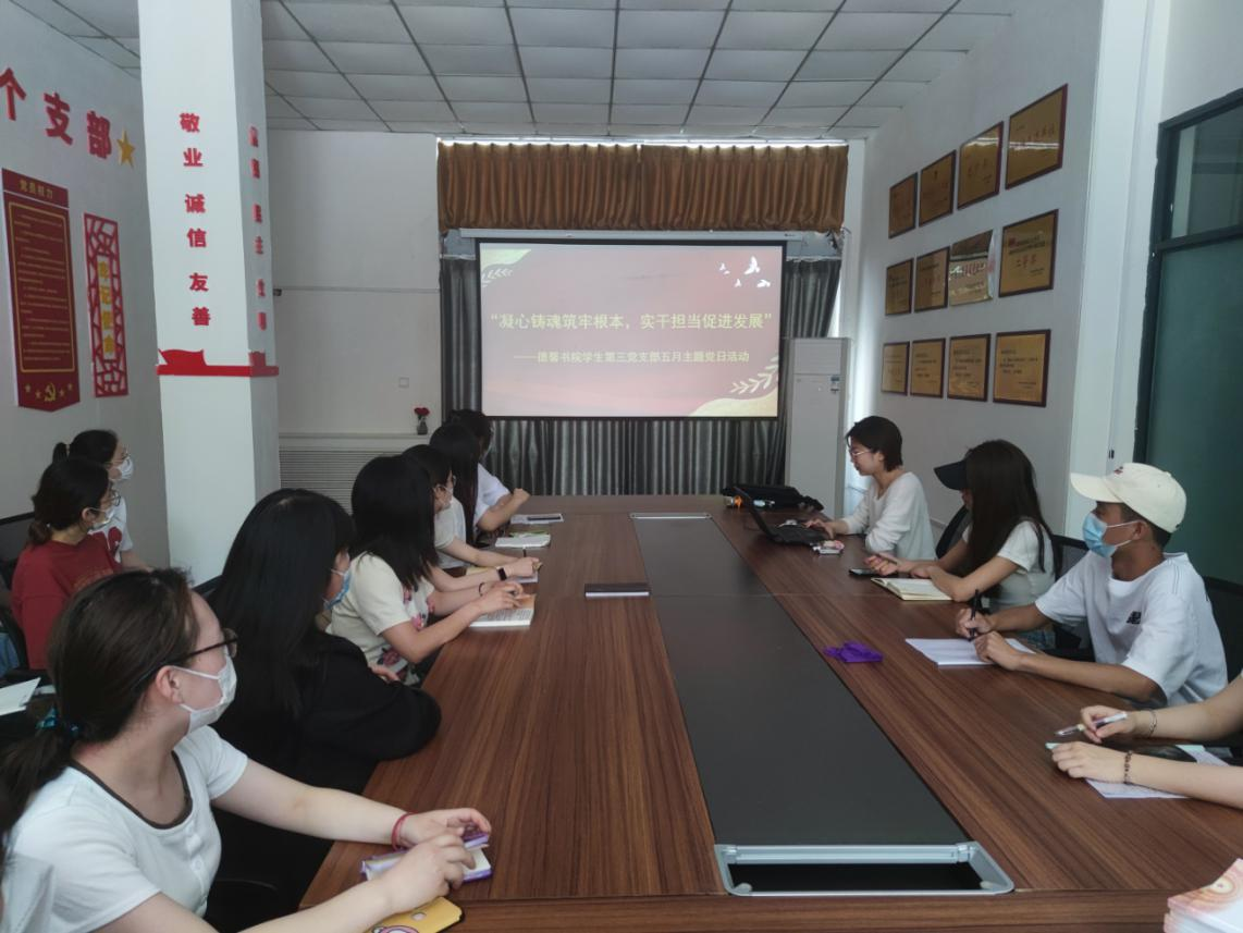 强国建设、民族复兴的宏伟目标令人鼓舞、催人奋进,我们这一代共产党人使命光荣、责任重大。根据我校五月主题党日活动要求,德馨书院学生第三党支部于5月19 日,通过召开本月“凝心铸魂筑牢根本 实干担当促进发展——深入开展学习贯彻习近平新时代中国特色社会主义思想主题教育”主题党日活动及五月政治理论学习,党支部全体党员参加本次活动。