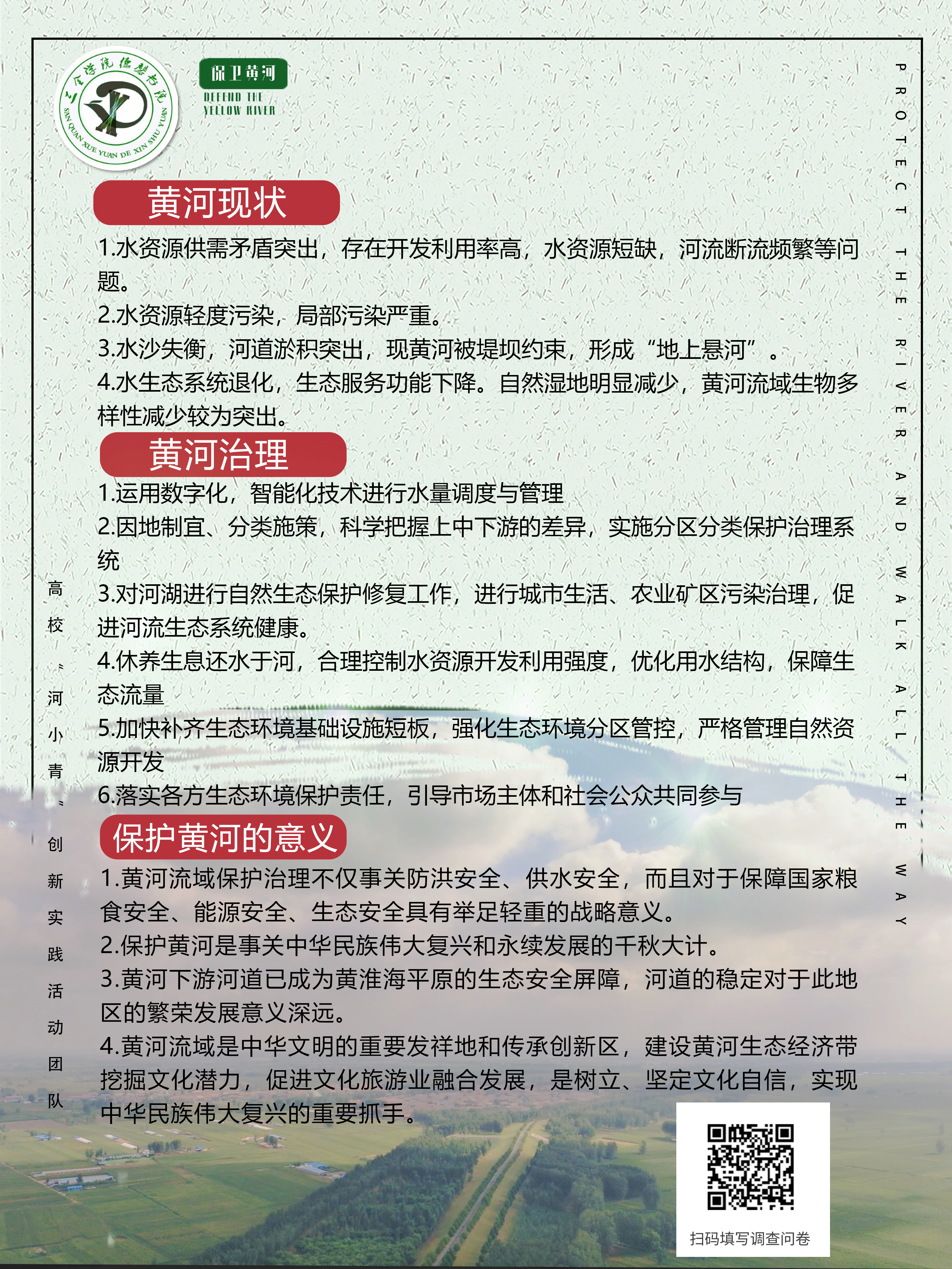 通过本次的宣传活动,团队成员不仅向人民群众介绍了黄河的相关知识,加深群众对黄河的了解,也让更多的人加入到建设黄河文化,保护黄河生态环境的队伍中来。黄河是中华民族的母亲河,黄河流域生态保护和高质量发展是事关中华民族伟大复兴的千秋大计。新时代新征程,关注我们的母亲河,助力黄河流域生态文明建设。