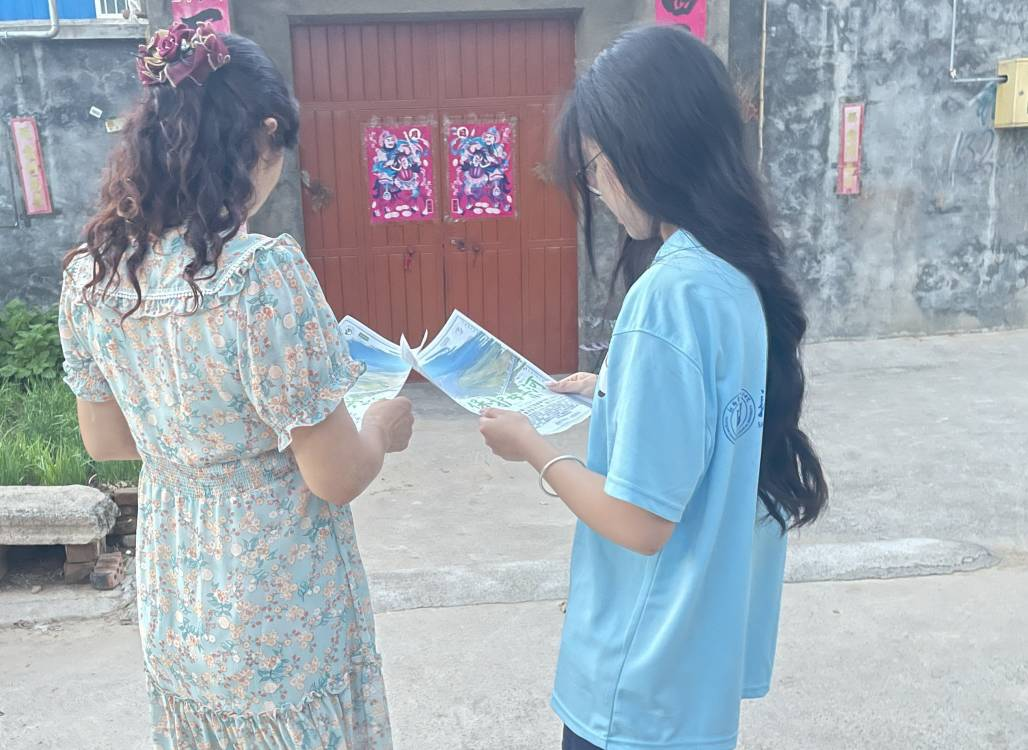 首先进行的内容是发放宣传单。此宣传单是团队成员通过实地游学实践,查询大量相关资料后进行讨论研究,再交由指导老师审核修改制作而成。宣传单背景选取实地游学时拍摄的照片,照片上蓝天与黄河相接,两岸是成片的绿色耕田,构成一幅人与自然和谐共生的美丽画卷。在发放过程中团队成员积极引导群众阅读宣传单内容,讲解黄河文化,解答群众提出的问题。