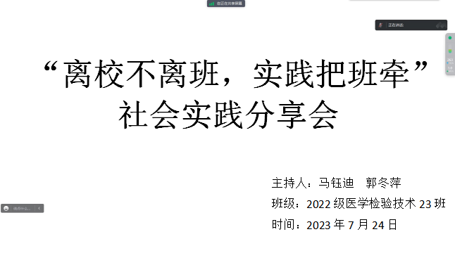 贡献青春力量,书写青年担当,同学们用青春书写实践故事,在假期大舞台上贡献青春力量。随着社会实践的逐步结束,7月24日德馨书院2022级医学检验技术23班的同学们在线上开展了“离校不离班,实践把班牵”社会实践分享会,班长郭冬萍,生活委员马钰迪主持会议。
