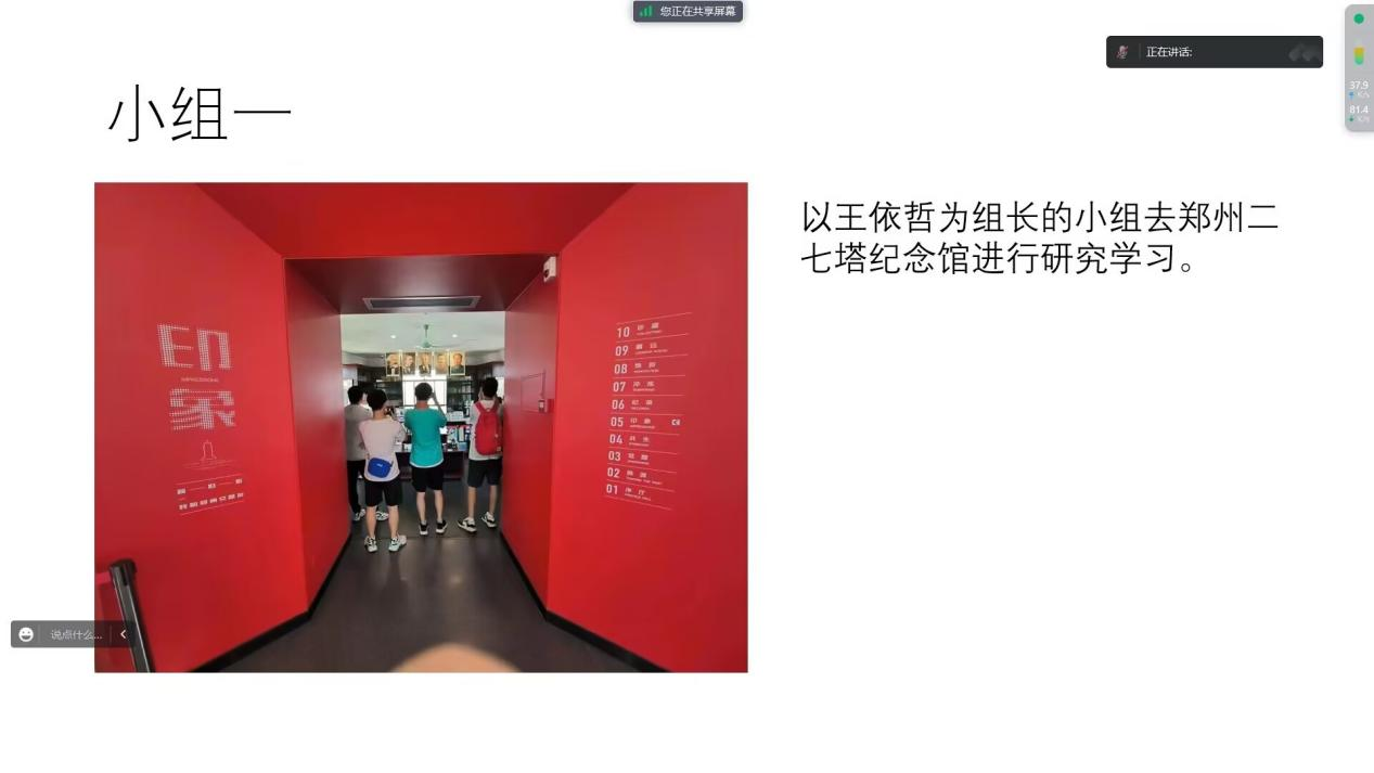 首先“赴二七纪念塔红色游学宣讲教育团”向大家分享了团队到二七纪念塔参观学习的经历。本次分享会他们也分享了自己参观后的一些体会,他们表示:来到纪念塔,肃然起敬,通过参观自己能深刻的体会到革命先烈的爱国情怀,舍身报国的崇高精神。