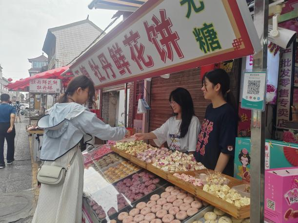 7月15日,实践团首先通过网络搜索有关鲜花饼的文化历史及其由来,并求证了当地的商家其知识的真实可靠性。7月16日—7月19日,实践团将成员分为两批,分别在老城区十字街以及西工区商贸市场附近,通过摆摊和走访宣传的方式吸引游客,向游客们讲解鲜花饼的有关知识,让游客们能够充分了解到鲜花饼的悠久历史和益处。不仅如此,实践团通过网络查询和街头走访的形式,在宣传和提高自己认知的同时,也充分锻炼了团队成员的社交能力和处理问题的能力,同时又了解到了洛阳所特有的其他传统美食,开拓了团队成员的视野。7月20日—7月21日,实践团在老城区十字街附近找到了售卖鲜花饼的相关商家,并利用前几天所学习到的知识和积累的经验,帮助商家出售鲜花饼。团队成员在努力促进销售的同时,切实感受到鲜花饼在洛阳的独特魅力。
