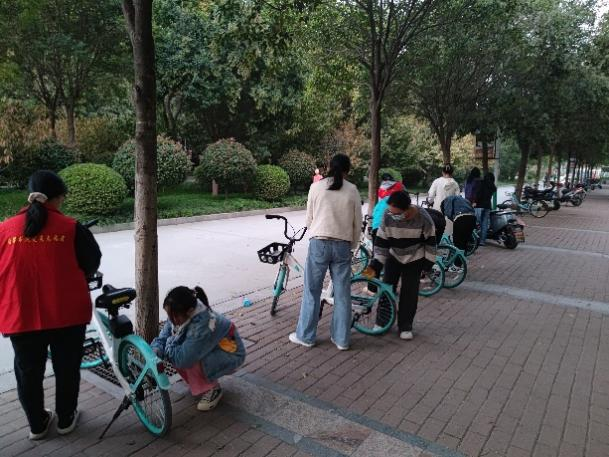 志愿者们通过分工后,前往各自负责的清扫区域。清扫过程中,志愿者认真负责、积极配合、分工合作,不仅重新摆放了共享单车,同时也对一些学生的个人车辆进行了清洁,还清理了车辆停放周边的垃圾。每位同学都干劲十足,相互配合,不怕脏累,充分展现了学生们阳光向上,朝气蓬勃的精神风貌。经过同学们的辛勤劳动,校园环境变得整齐有序,同学们也在劳动中进一步传承和发扬了无私奉献、乐于助人、艰苦奋斗的精神。志愿者宁珂同学说:“文明出行需要每个人都为此而用心努力,共享单车的摆放也影响着一个学院的校园环境,每一位使用共享单车的同学都应该遵守停放规定,共同营造更加美好的校园环境。”