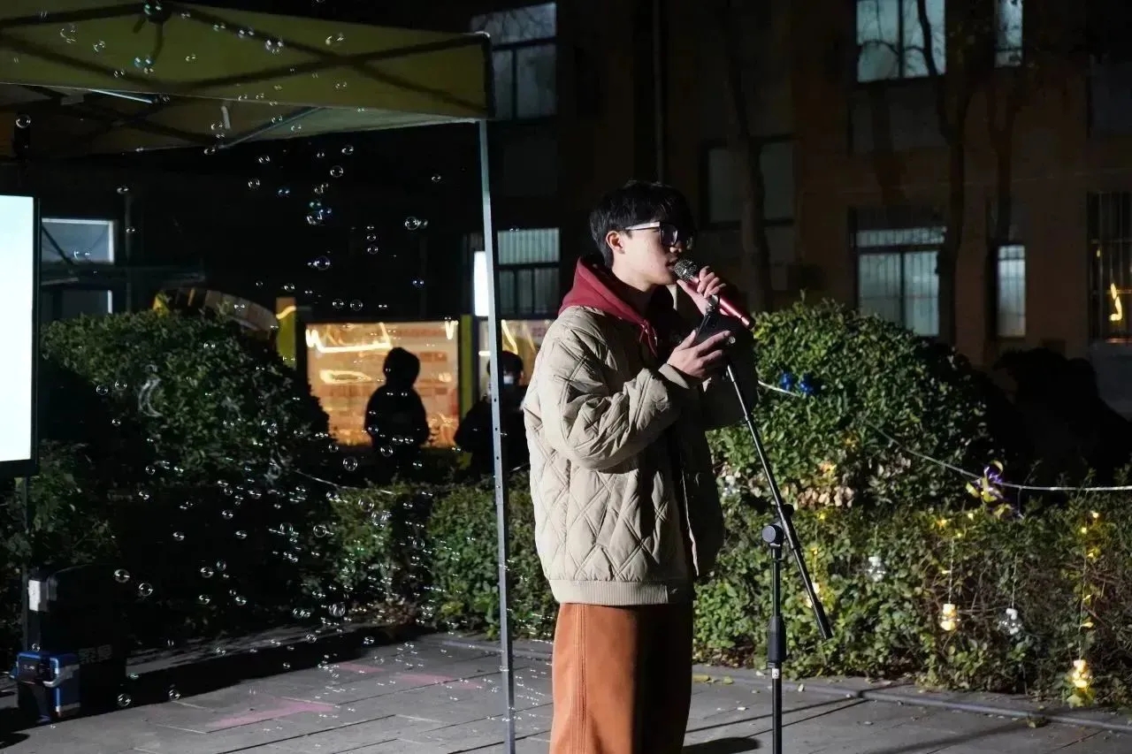 恰逢初雪遇星光,在晚会正式开始之际,今年的第一场初雪悄然而至,寒冷的天气和突降的风雪并没有吹散同学们的热情,晚会尚未开始,观众席就已站满了热情的同学们。雪落枝头,在灯光的映照下,留下独属于德馨学子的冬日浪漫。