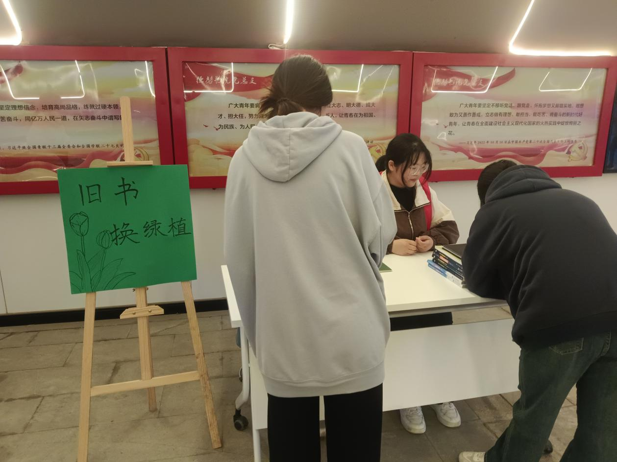 活动当天,志愿者们早早地将各种绿植摆放在服务区内等待着同学们带着闲置的书籍来交换,翠绿的叶片和多样的花朵为校园增添了一抹生机。热情的志愿者们向前来置换的同学耐心的介绍各种绿植的特点,争取让每位同学都能够更好地挑选到自己喜欢并适合的绿植。当同学们捧起心仪的绿植时,脸上洋溢着兴奋和喜悦,他们都表示会好好照顾这些绿植,让它们在自己的书桌或阳台上茁壮成长,绽放光彩。