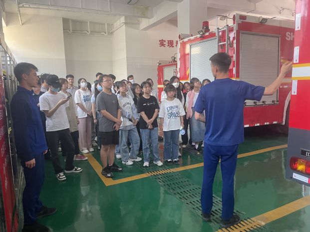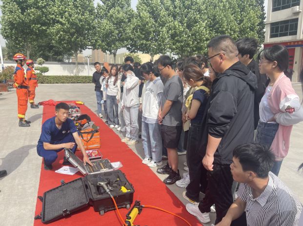 首先,消防救援指战员向同学们详细介绍了各类消防车辆及个人装备的用途,现场展示了液压破拆组合工具、无齿锯、机动链锯、空气呼吸器、消防灭火防护服等装备器材,大家不停地用手机拍照,还饶有兴趣地与消防指战员进行互动交流。紧接着,到了同学们都很感兴趣的环节-观看消防实战演练。在消防训练塔,消防员进行绳索攀爬训练,他们徒手沿着绳索攀爬上高楼,并向同学们演示各种救援环节,行动迅速,严格高效。