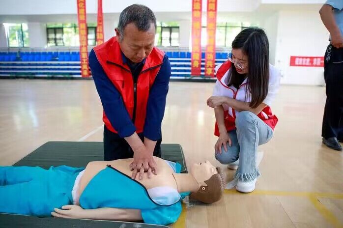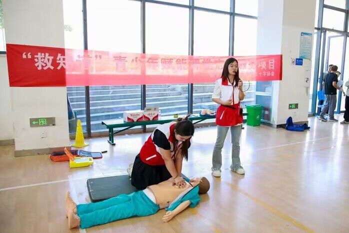 弘扬红十字精神,传播红十字文化。为切实提高新乡市中小学教师应急救护能力,改善技能培训缺乏的现状,提升应急救护知识的掌握能力,提高学校对于急救知识的普及率,加强校园的安全建设。5月15日,德馨书院联合校团委前往平原新区第一初级中学开展“救知道”青少年赋能课堂志愿服务项目,以应急救护知识宣传、技能培训和志愿服务活动为抓手,面向平原新区第一初级中学100名教师进行急救实践技能的培训。