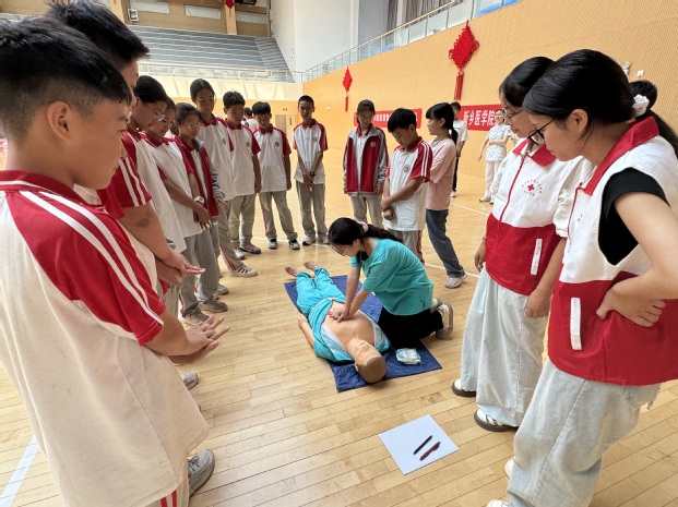 为进一步培养新乡市中小学生应急救护能力,掌握心肺复苏技能,让中小学生学深学透应急救护知识,做强做优应急救护品牌,落地落实应急救护服务,形成“人人学急救,人人会急救,人人敢急救,急救为人人”的良好局面和社会风尚。9月14日上午,德馨书院联合校团委、护理学院带领红十字协会志愿者前往平原外国语学校开展“救知道”青少年赋能课堂志愿服务活动,680名学生参加了此次急救技能培训。
