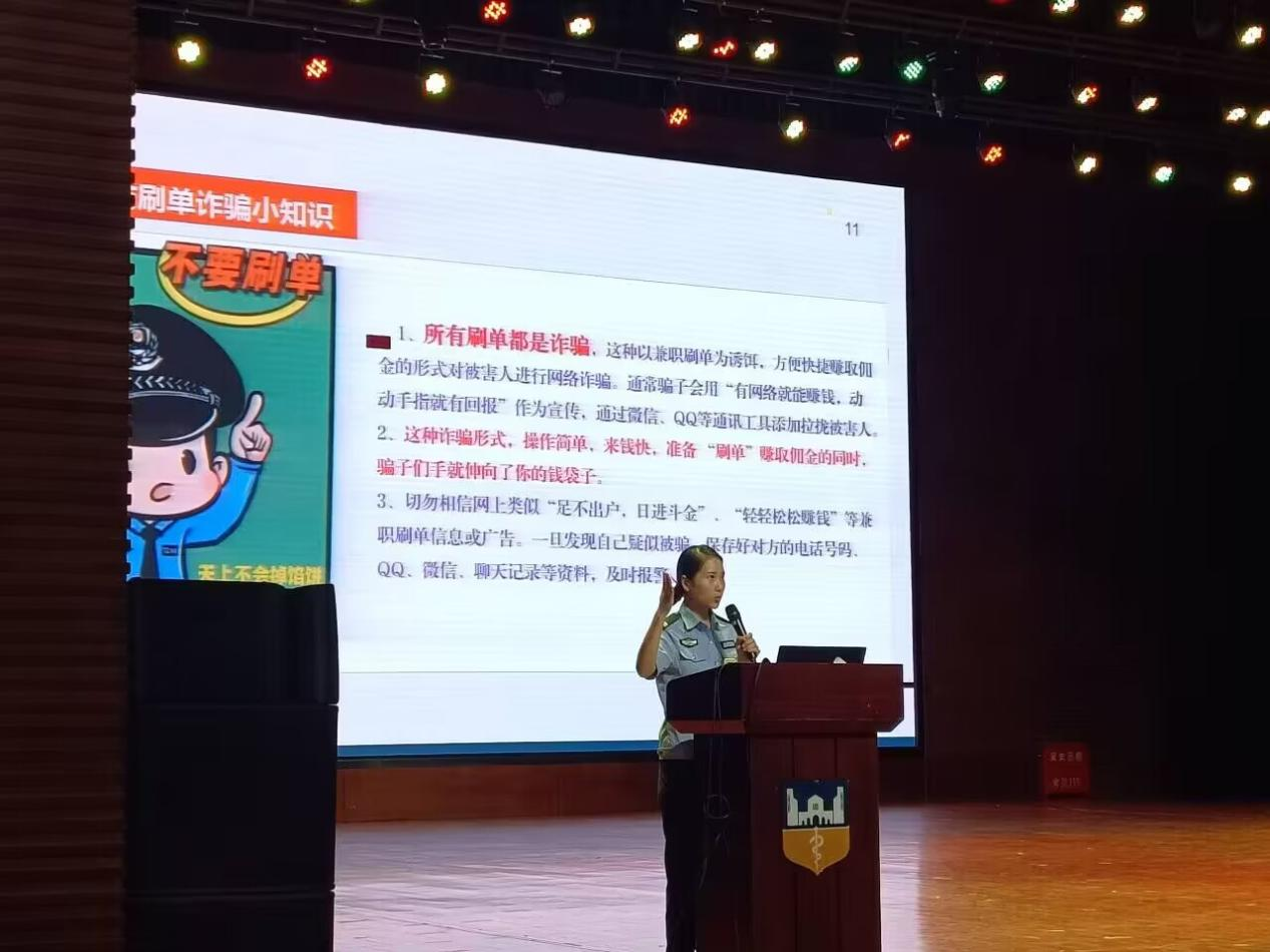 司念以高校发生的真实又残酷的案例为警示,详细讲解了近年来电信网络诈骗案件的常见类型和套路,以及如何在平时提高防范能力和防范意识。随后,她给大学生提出防范电信诈骗的“三不要”忠告:(1)不轻信:不轻信来历不明的电话和信息;(2)不透漏:不随意透露自己及家人的身份信息、存款、银行卡等情况;(3)不转账:不向陌生人汇款、转账。“大学生只有牢固树立正确的消费观和金钱观,不贪图小利,理性消费,持续性学习掌握安全知识,增强防范意识,不断了解我们身边常见的各种诈骗行为,才能持续增强自身的防诈和反诈能力,避免成为网络诈骗的受骗人群和帮凶。”司念说道。新生报到后,安全稳定工作是重中之重。司念从阐述案例、提升学生安全防范意识等方面进行了全面的防诈骗安全教育。