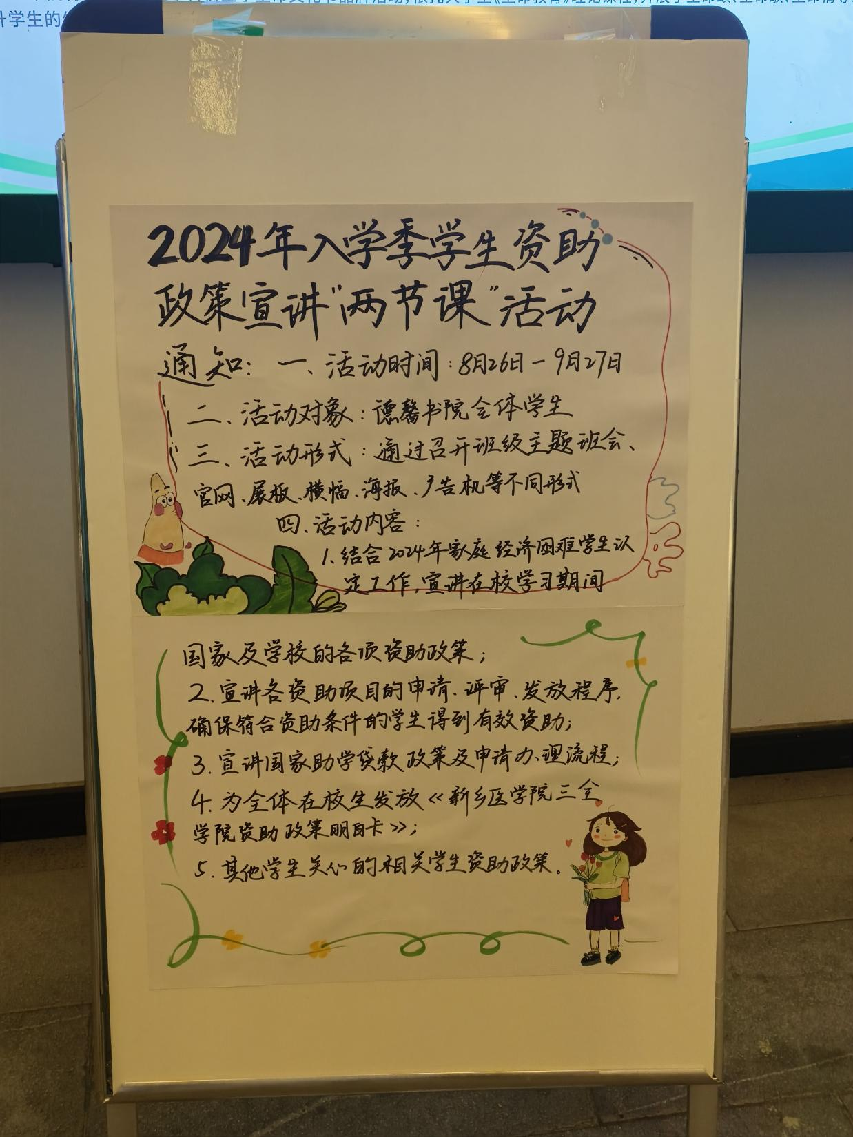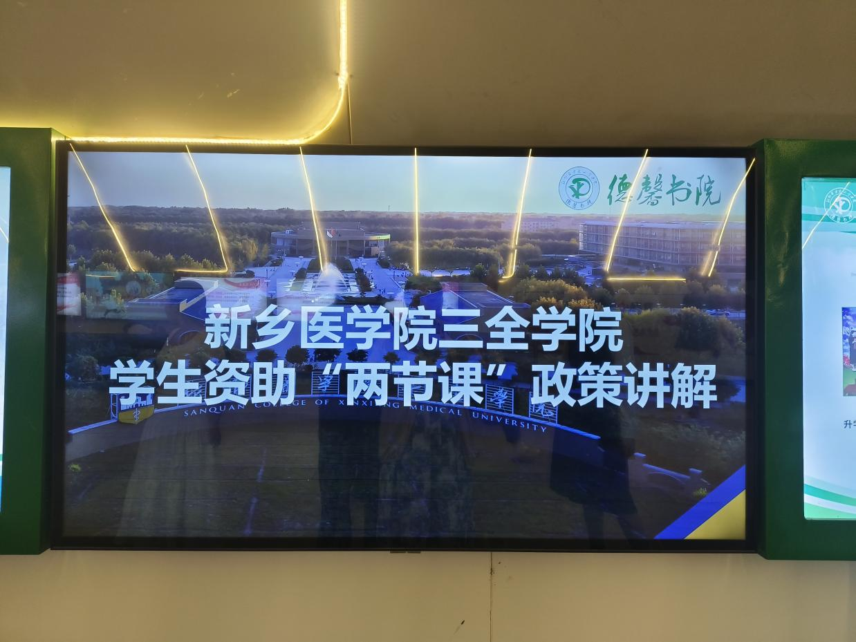 除了班会宣讲,书院运用广告机,播放关于学生资助政策的相关信息和视频,通过耳濡目染的方式提升学生对资助政策的认知度,加深学生对政策内容的理解。并将资助政策海报放置在书院门洞入口处,此举不仅提升了政策的可见性,同时方便来往的学生进一步认识和深化国家资助政策。