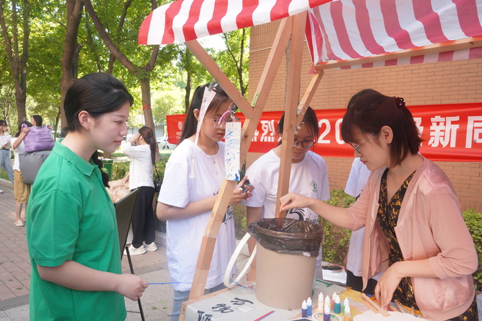趣味漆扇——馨宝们根据示范和说明,动手制作自己的漆扇,并与家人们合影留念,同时,学业导师也来到了迎新现场,与馨宝们亲切互动,为其漆扇题字送祝福,学业导师在为学生送去凉爽的同时,也促进了馨宝之间的沟通与交流,帮助他们快速融入新的环境,建立友谊。看,姓名打卡墙前围满了拍照的新生和家长。“姓名打卡墙”是由971名新生姓名组成的,吸引了许多家长和馨宝驻足,他们穿梭于打卡墙前,目光如炬,寻找着自己的名字。每一次发现,都伴随着一阵惊喜和欢呼,在这个过程中,他们找到的不仅是自己的名字,更是回家的感觉。“家长,天气炎热,您尝一下我们专门制作的中药茶饮”志愿者耐心热情地把中药茶饮递到了家长手中。“最近,中药茶饮,爆火出圈,迎新现场的中药茶饮是我们药学专业学生专门为新生及家长提供的,也是他们喜迎学弟学妹的一种方式,愿这杯茶饮,助馨宝和家长们树立健康生活理念,于舟车劳顿中寻得慰藉”。德馨书院党总支副书记平丹丹说道。