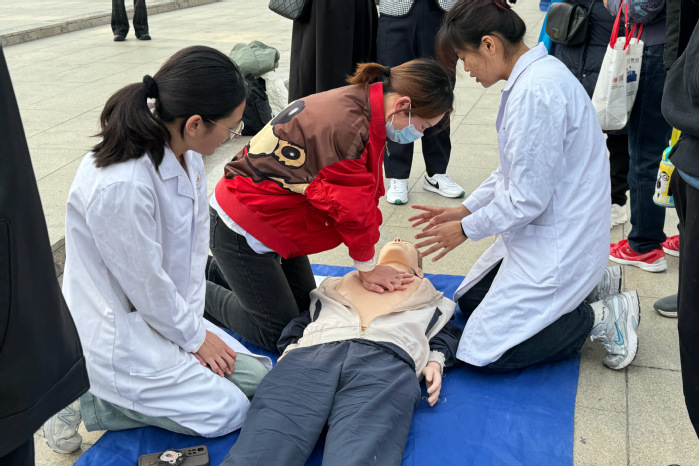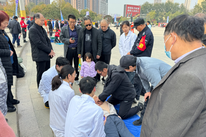 在现场,2021级临床医学专业学生发挥专业优势,向市民们普及应急救护知识。邢泰宇介绍了海姆立克急救法、心肺复苏的相关知识技能和适用场景,重点讲述了两种急救方法的使用情况判断以及准确要领,并进行了动作示范。随后,同学们利用模拟人进行了模拟演练,引导市民们学习如何判断病情或伤情、如何排除气道异物、如何进行心肺复苏。市民们认真观摩,踊跃参与,纷纷表示此次培训学习非常有意义。“今天我学到了很多急救知识,包括心肺复苏技巧等,特别是如何寻找按压点和正确的按压频率等要领都有所了解。平时在工作和生活中也会碰到意外事故,但自己因为不了解急救措施而束手无措。现在培训学习以后才发现,原来基础的急救措施也不难。”一位参与培训的市民朋友说道。“参加此次活动十分有意义,回到学校我一定将学到的消防知识和技能在校园内进行广泛传播,使广大师生都能及时关注和学习消防安全知识和灭火、逃生技能,为创建安全文明的校园贡献一份力量,同时之后也会努力学习专业知识,为健康中国贡献自己的青春力量!”2021级临床医学专业刘梦珂说道。