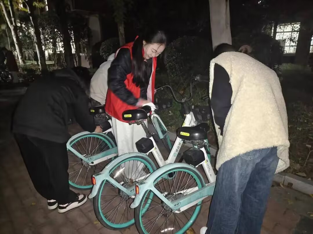活动当天,志愿者们身着统一的服装,在负责人的带领下,分赴各自负责的区域。他们迅速投入工作,对共享单车进行逐一清理和擦拭。志愿者们分工明确,有的负责清理车身的污渍,有的则负责将单车整齐摆放。尽管天气微凉,但志愿者们却干得热火朝天,他们不怕脏、不怕累,以实际行动诠释了志愿服务精神。在志愿者的共同努力下,原本杂乱无章的共享单车很快变得干净整洁,井然有序。这些焕然一新的单车不仅为校园增添了一道亮丽的风景线,也方便了同学们的出行。