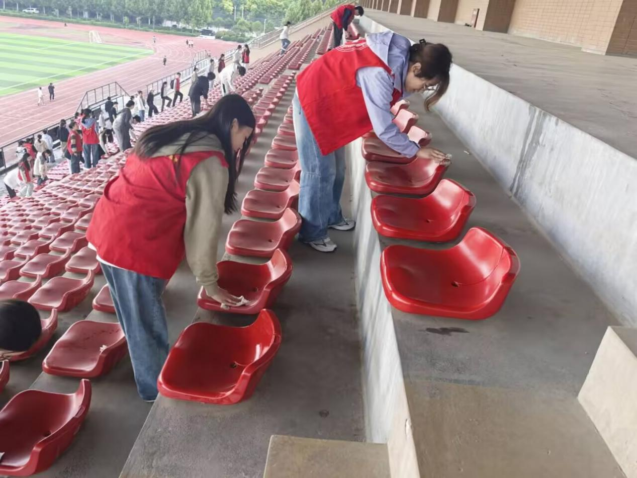 活动当天,志愿者们统一身着红马甲,手持抹布、扫帚等工具,到达操场校医院对面集合。负责人闻玉枝向志愿者详细阐述了活动的目标和安全注意事项,确保每位志愿者都能明确自己的任务和责任。然后,志愿者们被分为擦拭座椅、打扫垃圾、倒垃圾三个小组,在各自领队的带领下,他们前往指定的区域开始工作。负责擦拭座椅的志愿者们弯腰仔细地对每个椅子进行反复擦拭,确保每个角落都干净无尘。打扫垃圾的志愿者们认真地将地面上的垃圾清扫干净,倒垃圾的志愿者们则多次往返于垃圾桶和垃圾收集点之间,进行仔细的垃圾分类工作。他们的行动充分体现了对校园的热爱和对劳动的尊重。在经过数小时的共同努力后,志愿者们的辛勤工作使得操场的看台焕然一新,变得干净整洁。活动最后,负责人闻玉枝开始组织签退,志愿者们排列有序,进行扫码签退的工作。