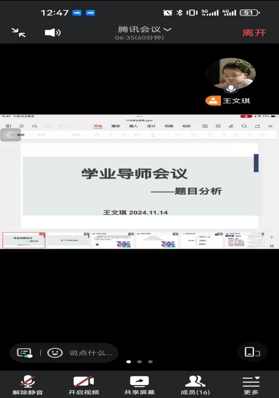 11月15日,2023级护理学专升本210班-212班学生在王文琪老师的带领下于腾讯会议展开以“选题指导”为主题的学业指导会议。王老师从毕业论文的选题、文献综述和题目等方面进行了全面指导,强调了选题与所学专业的紧密联系。她建议同学们广泛阅读相关文献,开阔视野,为论文撰写奠定坚实基础。在会议的最后,王老师还对同学们的论文框架进行了梳理,确保每位同学都能明确自己的研究方向和写作思路。