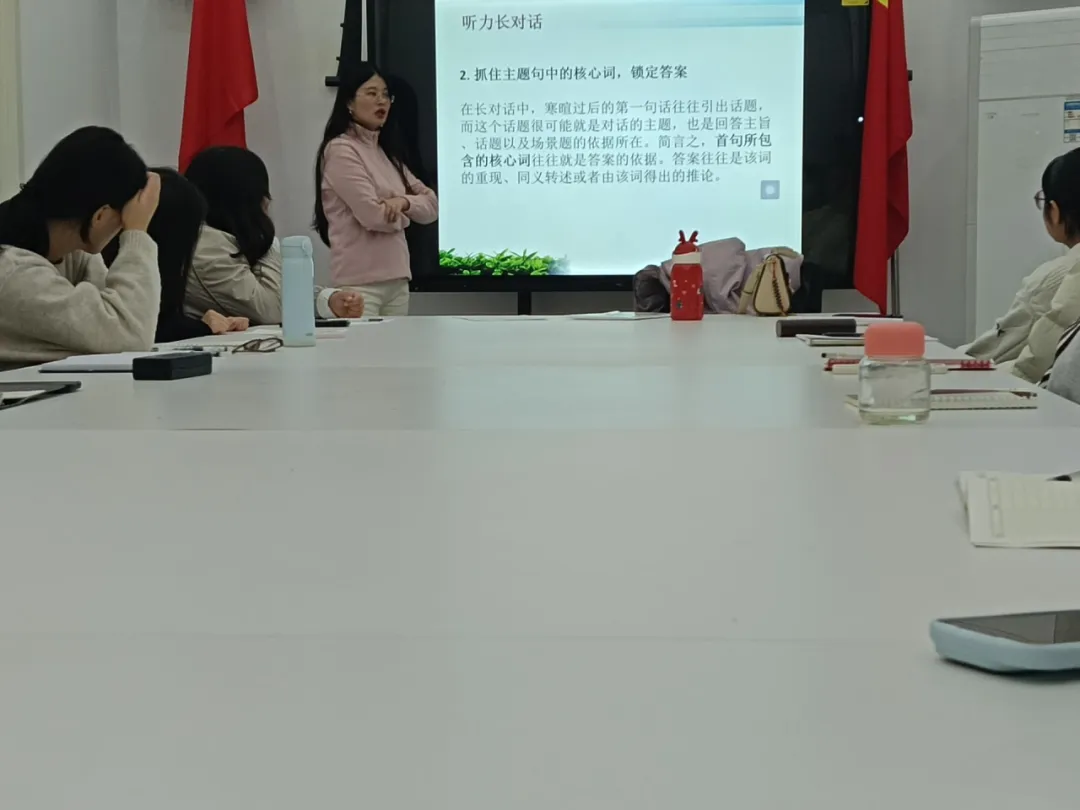 11月19日,2024级护理专业62-65班的同学们在马斐老师的指导下于一站式党员活动室举行了以“大学英语四级听力长对话的解题技巧”为主题的非专业学业导师会议。在本次会议中,马斐老师以往年四级听力真题为基础,详细讲解了常见的长对话类型以及高频词汇和场景。在会议的尾声,马斐老师还分享了一些听力考试的实用技巧。通过马斐老师的细致讲解,同学们对听力题型有了更深入的了解,增强了他们应对英语四级考试的信心。