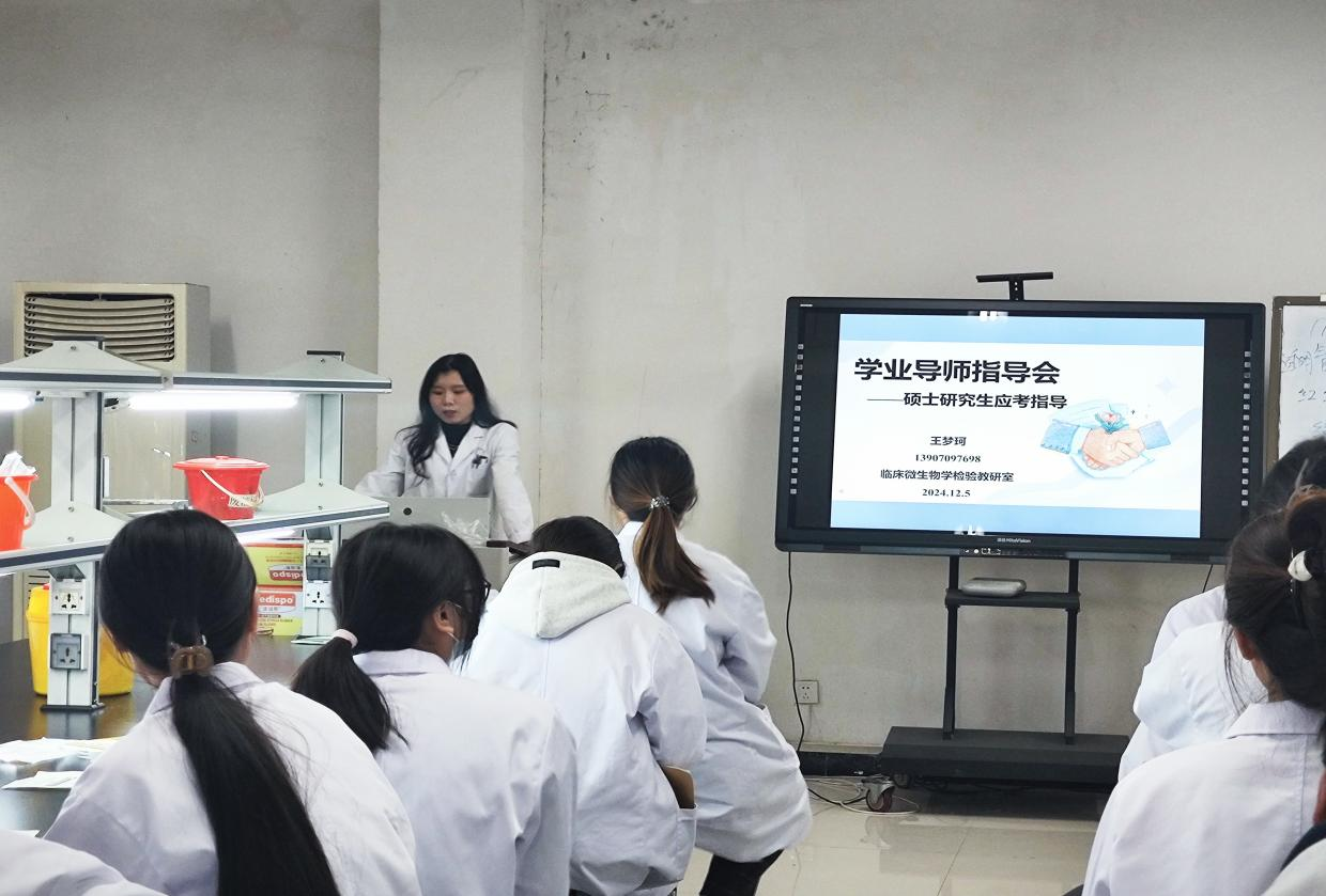 12月5日,2024级医学检验专升本181-182班学生们在学业导师王梦珂的带领下在医学检验学院三楼第五实验室开展了本月以“考研指导”为主题的学业指导会议。活动伊始,老师从学习方式(全日制和非全日制)培养目标和培养方式(学术型和专业型)及考试方式(统考、联考和推免)三个方面为同学们简单介绍了研究生的分类。紧接着,老师详细讲解了考研的流程,并给同学们分享了一些考研的方法与建议。最后,王老师鼓励同学们从现在就要开始努力,不松懈不放弃,向着自己的目标前进。此次会议的开展,不仅帮助同学们明确了学习方向,还提供了有效的备考策略,使大家能够更加高效地投入复习,避免了不必要的弯路,显著提升了学习效率。