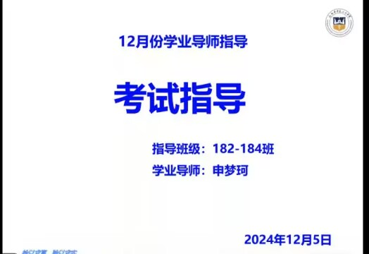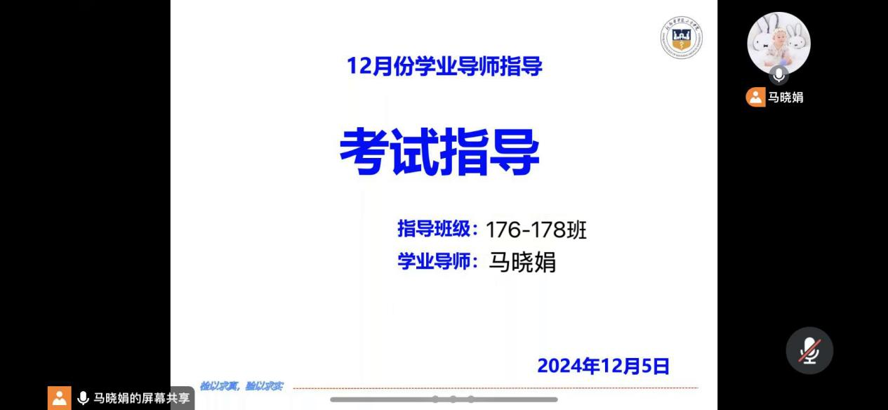 12月5日,2023级医学检验技术182-184班学生在申梦珂老师的带领下在腾讯会议开展了以“考试指导”为主题的学业指导会议。活动伊始,申老师针对近期各类考试指导了同学们如何准备及调整心态,强调:同学们一定要清楚各类考试的时间和安排,对时间进行合理规划与利用。最后,申梦珂老师和同学们分享了科学的备考方法,纠正了一部分同学错误的备考模式,帮助他们制定了合理的复习计划。此次会议不仅告知同学们如何正确看待考试,还提供了准备考试的方法,从而有效缓解了他们的焦虑情绪,使大家能够以更平和的心态面对即将到来的挑战。