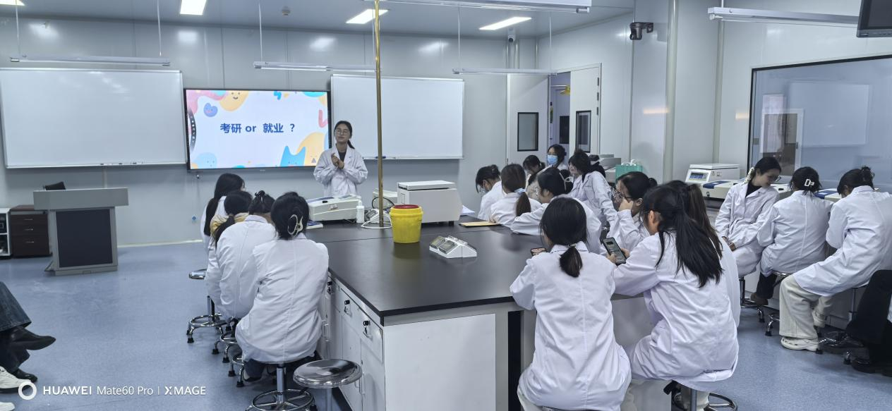 12月5日,2024级医学检验技术专升本185-186班学生在王娜老师的带领下于检验学院四楼生物化学实验室举办了以“医学检验技术专业考研和就业方向”为主题的学业导师会议。活动伊始,王娜老师向同学们介绍了医学检验技术这个专业考研和就业方向,以及目前行业的优势和局限性,为同学们明确了努力的方向。接着,王娜老师为大家介绍了考研的自我评估、确定目标、备考、考试复试这几个阶段的注意事项以及就业方向规划的几个阶段,帮助大家更精确定位也为未来的规划提供了方向。最后,王娜老师对同学们提出的考研、就业方面的问题进行了答疑解惑,使同学们更加清晰明了,对考研或就业提供了指导。此次会议的开展既为同学们提供了考研的方向与策略,激发了同学们的考研热情,也提升了同学们的备考效率。
