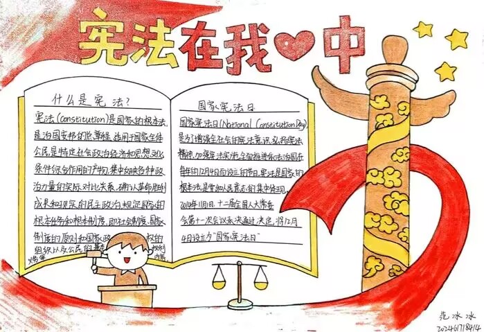 学生们充分发挥创意和艺术才能,精心制作了法治主题手抄报。他们以生动形象的插画、简洁明了的文字以及富有创意的排版,将法律知识巧妙地融入其中。手抄报内容涵盖了宪法、民法等多个领域的法律法规,既有对法律条文的解读,也有实际案例的分析,还有对校园生活中常见法律问题的解答。这些作品不仅展示了学生们扎实的绘画功底和出色的创意设计能力,更体现了他们对法律知识的深入理解和对法治精神的深刻领悟,成为传播法治文化的一道亮丽风景线。