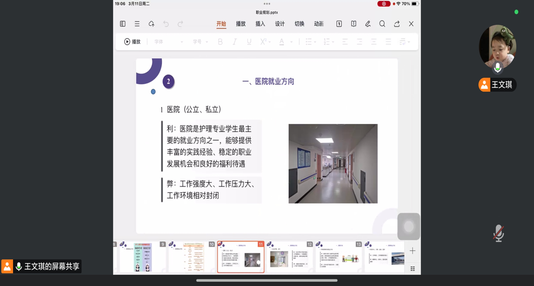 3月11日,2023级护理学专业210-212班在学业导师王文琪的带领下,通过腾讯会议开展了以“就业指导”为主题的学业指导会议。首先,王文琪老师向同学们介绍了当前护理学专业的就业形势与政策。近年来,护理学专业毕业生的就业形势总体向好,但结构性矛盾依然存在。一方面,随着老龄化社会的到来以及医疗健康服务需求的增长,护理人才的就业空间不断拓宽;另一方面,部分毕业生对基层岗位的接受度较低,导致就业区域分布不均衡。接着,王文琪老师为同学们详细讲解了多措并举促就业的政策,包括访企拓岗以拓宽就业渠道、举办专场招聘会搭建就业平台、开展就业指导提升求职能力等。这些举措为同学们的就业提供了有力支持。最后,王文琪老师指出,国家针对就业困难群体出台了一系列相关政策,为同学们提供了更多就业资源。通过此次指导,同学们对就业问题有了更清晰的认识,面对找工作时也更加自信。