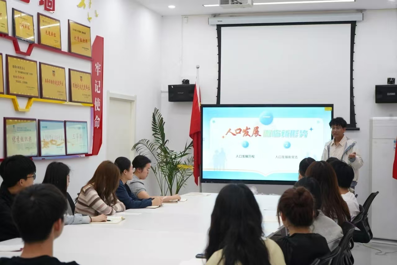 本次课程邀请了马克思主义学院王明宽老师来为同学们进行深入讲解。培训中,王明宽老师从新中国成立以来的人口发展历程切入,系统梳理了人口规模、素质、结构的历史性跨越。首先,他指出:“当前中国人口发展进入新常态:总量转向减量发展阶段,老龄化与少子化特征凸显,但人口综合素质显著提升,‘人才红利’正逐步形成。”面对人口负增长与老龄化加速的双重挑战,王老师强调:“青年一代既要清醒认识人口形势的复杂性,更要看到转型中蕴藏的新机遇——从‘人口红利’向‘人才红利’的跃升,正是高质量发展的关键引擎。”此外,他还辩证分析人口负增长的深远影响:“短期内,人口负增长对经济增长影响是温和的;但长远看,人口负增长对经济增长会产生一定冲击,对此,必须做好充分准备,积极有效应对。”