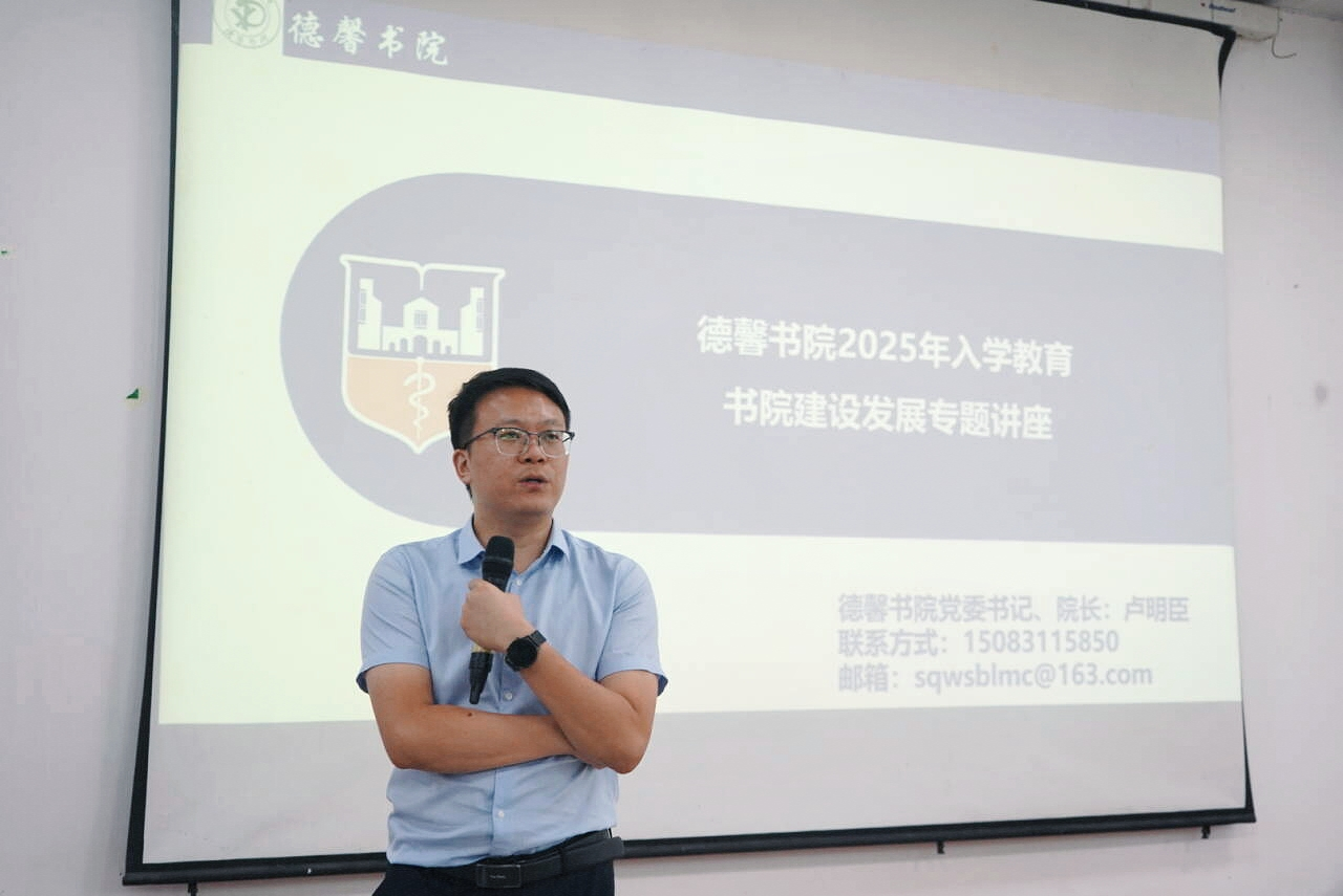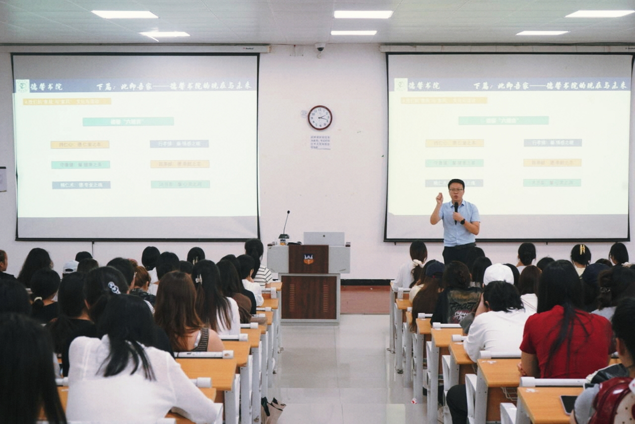为进一步增强2025级新生对学校的归属感,帮助他们较快融入德馨书院大家庭,顺利开启美好大学生活。9月9日,德馨书院党委书记卢明臣先后于学校谨学楼D1大教室、闻德礼堂为书院2025级新生组织开展“开学第一课”讲座。全体新生辅导员及1200余名新生参加。