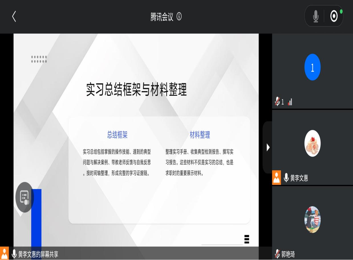 9月11日,2024级医学检验技术专升本181-182班全体同学在王梦柯老师的带领下,通过线上腾讯会议开展了以“从课堂到职场:医学检验实习适应性分享会”为主题的学业导师会。会上,王梦柯老师先阐述实习对提升职业能力、培养临床思维的意义,结合检验岗位特点指导角色转换与规范养成;随后剖析实习难题并给出应对策略,引导学生制定能力提升清单,还做心理疏导、组织交流点评,同时传授实习日志撰写要点。此次实习指导精准聚焦学生核心需求,不仅有效解答了大家在实习定位、实习期间难题应对等方面的关键疑惑,更通过清晰的流程拆解,帮助学生明确了实习适应阶段的具体步骤,为后续实习推进奠定了扎实基础。