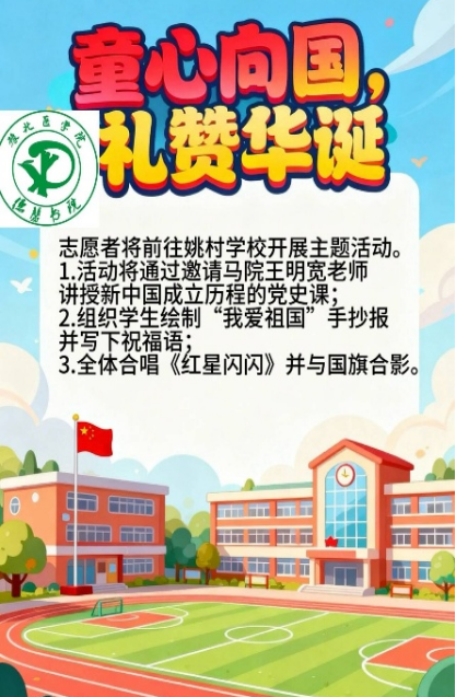为深化小学生爱国主义情怀培育,志愿者们将赴姚村学校开展“童心向国,礼赞华诞”主题活动。活动特邀马克思主义学院王明宽老师,讲授以新中国成立历程为核心的党史专题课;同步组织学生创作“我爱祖国”主题手抄报并书写真挚祝福,开展全体合唱《红星闪闪》、与国旗合影等特色环节,引导孩子们深刻体悟祖国发展的艰辛历程,珍惜当下美好生活,树立“强国复兴有我”的坚定信念,展现新时代青少年积极向上的精神风貌。