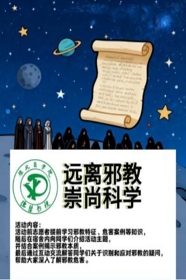 为“揭露邪教本质,增强防范意识”,志愿者们将于10月18日走进学生宿舍,开展“远离邪教,崇尚科学”主题宣讲活动。活动前期,志愿者们提前进行系统性学习,深入掌握邪教特征、典型危害案例等核心知识,为精准宣讲夯实认知基础;宣讲期间,志愿者们先清晰阐释活动主旨,再结合真实案例深入剖析邪教以精神控制为手段、诱导背离真理思想的核心本质;最后设置互动交流环节,耐心解答同学们关于邪教识别、应对方法的疑问。此次活动旨在帮助同学们深刻认清邪教危害,切实提升抵御邪教的能力,树立科学健康的思想观念与价值导向。