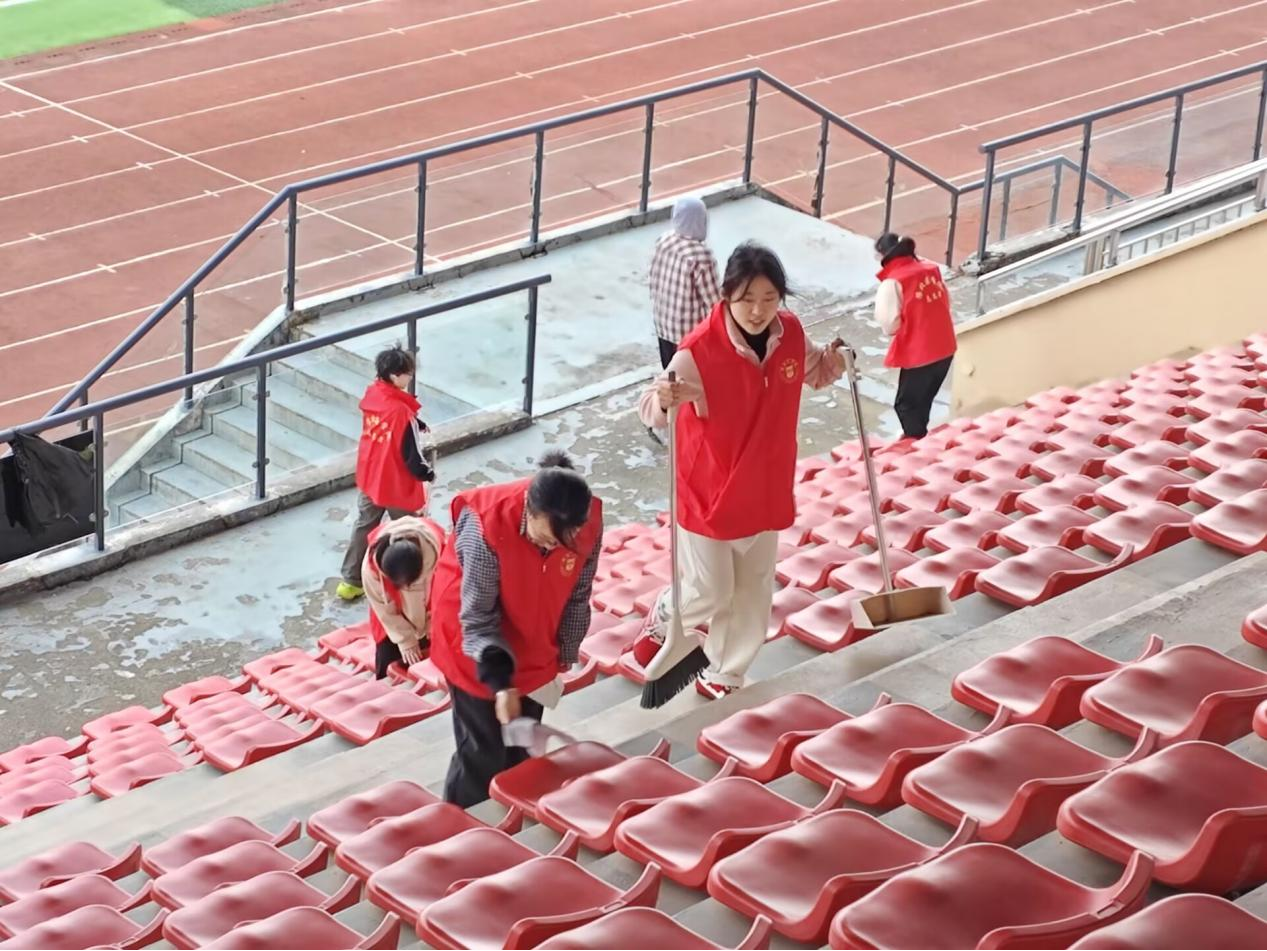 活动正式启动后,志愿者们手持扫帚、垃圾袋与清洁刷等工具,以饱满的热情投入清扫工作。面对宽广的看台与繁杂的垃圾,大家毫无畏色,迅速明确分工:有人专注擦拭座椅,细致清除表面尘埃与遗留杂物;有人俯身清理台阶,耐心捡拾缝隙中藏匿的纸屑;还有人专门负责垃圾的收集与搬运,现场秩序井然。