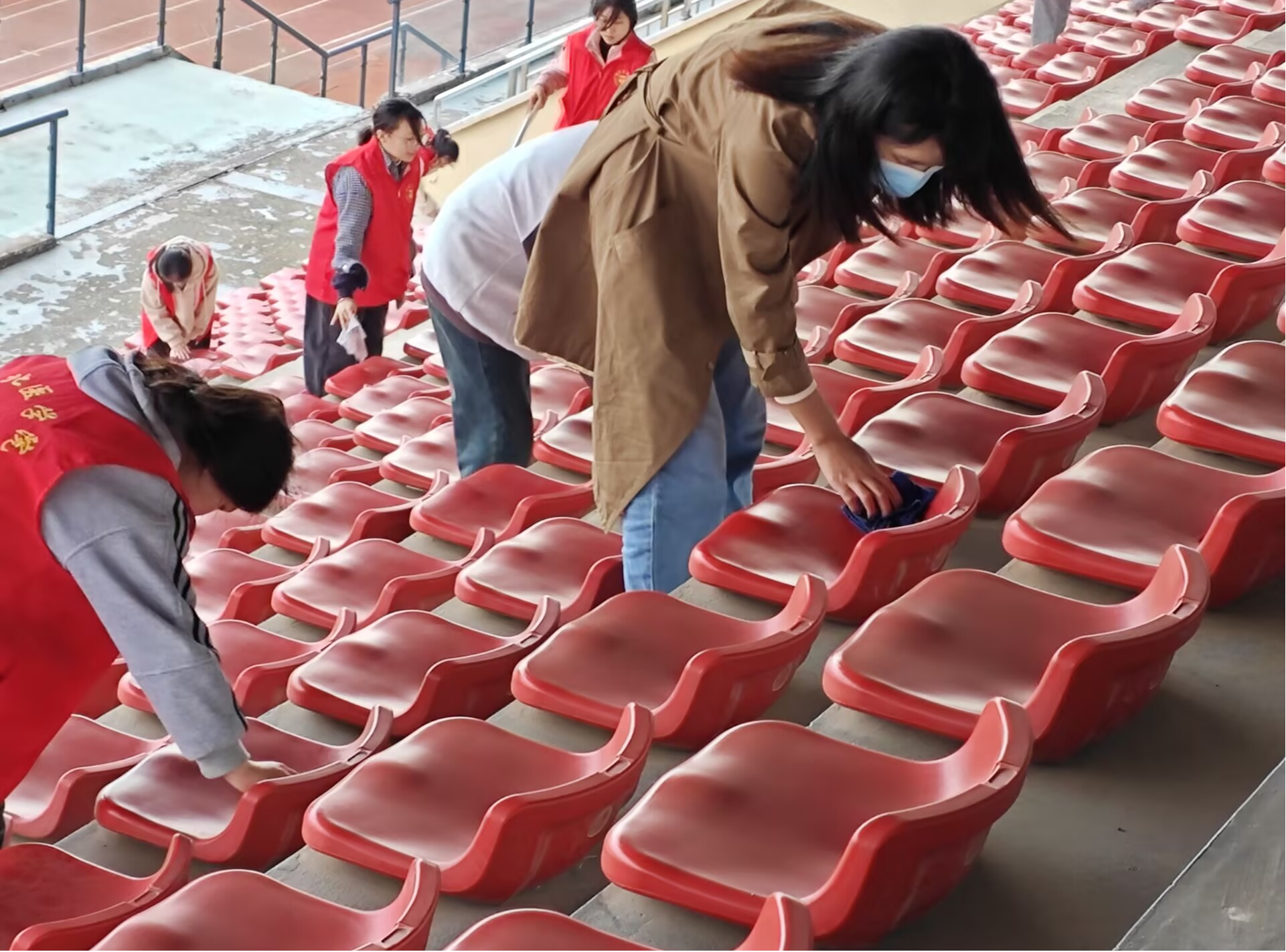 志愿者常佳怡感慨道:“之前看台上斑驳的污渍像一块块‘牛皮癣’,我们亲手把它们‘治愈’了。阳光洒下来,连风都带着清爽的味道。原来‘奉献’不是遥远的口号,就是弯一次腰、擦一把椅、抬一次头时,心里忽然涌起的踏实感。下次活动,我还报名!”