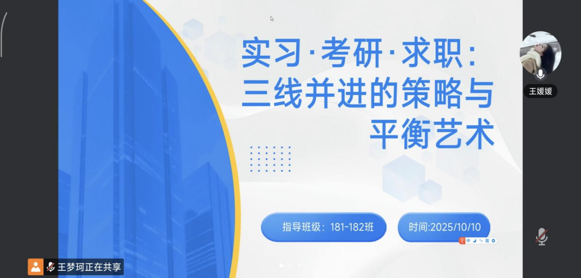 10月10日,2024级医学检验技术专升本181班-182班全体学生在学业导师王梦珂的带领下,于腾讯会议开展了以“实习·考研·求职:三线并进的策略与平衡艺术”为主题的学业指导会议。本次会议旨在为学生明确实习、考研与求职的平衡策略,助力他们清晰规划学业与职业发展方向。会议伊始,王梦珂老师强调实习、考研和求职需融合而非割裂,以医院实习病例为例说明可作为考研复习活教材。接着,王梦珂老师指出实习表现对留院同学很重要,阐明三者相互促进。随后,王梦珂老师建议用“大石头理论”管理时间,针对考研和找工作同学分别给出精力分配、时间安排策略。最后,王梦珂老师提醒道,考研失利后积累的知识对求职仍有帮助,二者可相互促进。通过本次会议指导,同学们更加清晰地认识到自己专业的发展前景,对未来的学业和职业发展有了更清晰的方向。