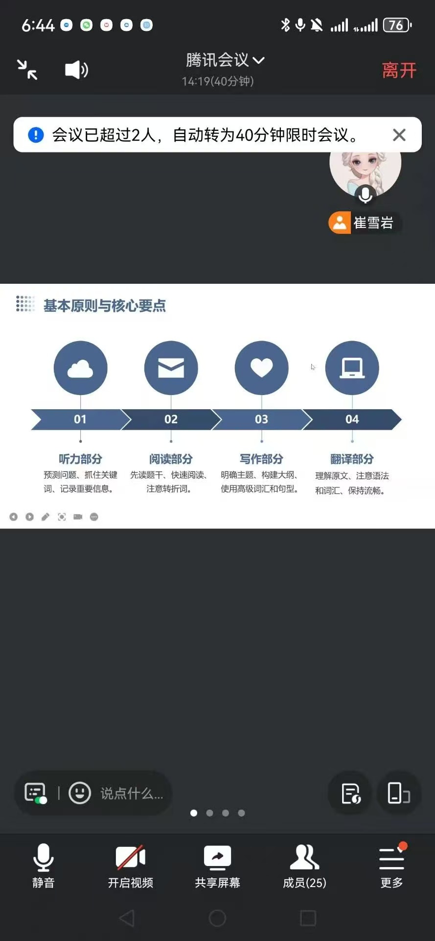 11月12日,2024级护理学专升本215-216班的同学们在学业导师崔雪岩的带领下,于线上腾讯会议开展了以“四六级考试指导”为主题的学业导师会议。会议伊始,崔雪岩老师细致入微地解读了考试的各种题型、分值分配以及评分细则,着重指出听力和阅读是提高考试成绩的重要环节,并特别提醒同学们在写作和翻译时要注重语言的规范化表达。随后,在备考策略上,崔雪岩老师提出了分阶段有序复习的建议:首先,要扎实打好词汇和语法的基础;其次,要加强对真题技巧的实战训练;最后,通过全真模拟考试来提高答题效率。此外,崔雪岩老师还分享了听力训练中精听与泛听相结合、阅读理解中定位关键词等有效技巧。本次指导会议有效地解决了同学们在备考过程中遇到的困惑,为他们指明了复习的方向。